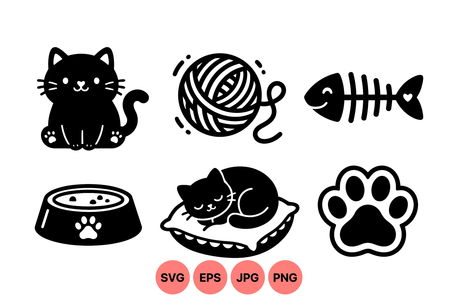 Cute Cat Vector Cat Silhouette Clipart Paw Print Illustration Kitten Sleeping Graphic Cat Playing Yarn Fishbone Clipart Design Pet Food Bowl Icon Animal Paw Graphic Feline Pet Artwork Cat Sitting Illustration
