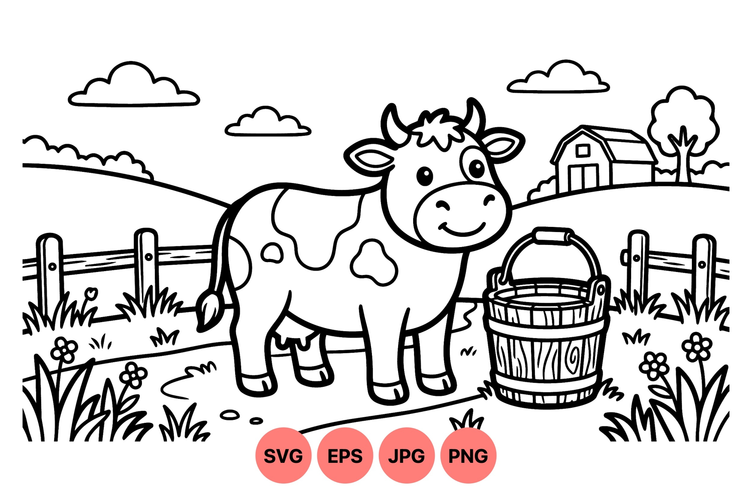 Adorable cartoon cow with smiling face stands beside a wooden bucket on a farm path surrounded by grass flowers fence and a barn in the background playful line art style