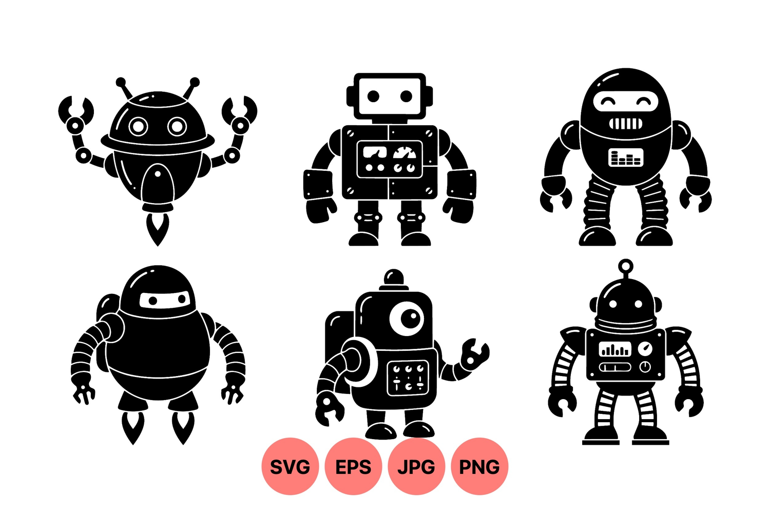 of six black silhouette retro robots showing diverse mechanical arm gestures and features in flat vector art suitable for technology icons or playful designs with simple style.