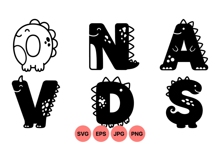 Playful vector art showing alphabet letters o n a v d s transformed into smiling dinosaur shapes in black and white with fun spikes and spots for children or educational use.