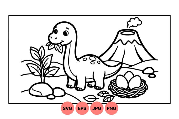 A cute baby dinosaur munches on leaves beside a nest containing eggs with a smoking volcano erupting in the background in a simple black and white line art style.