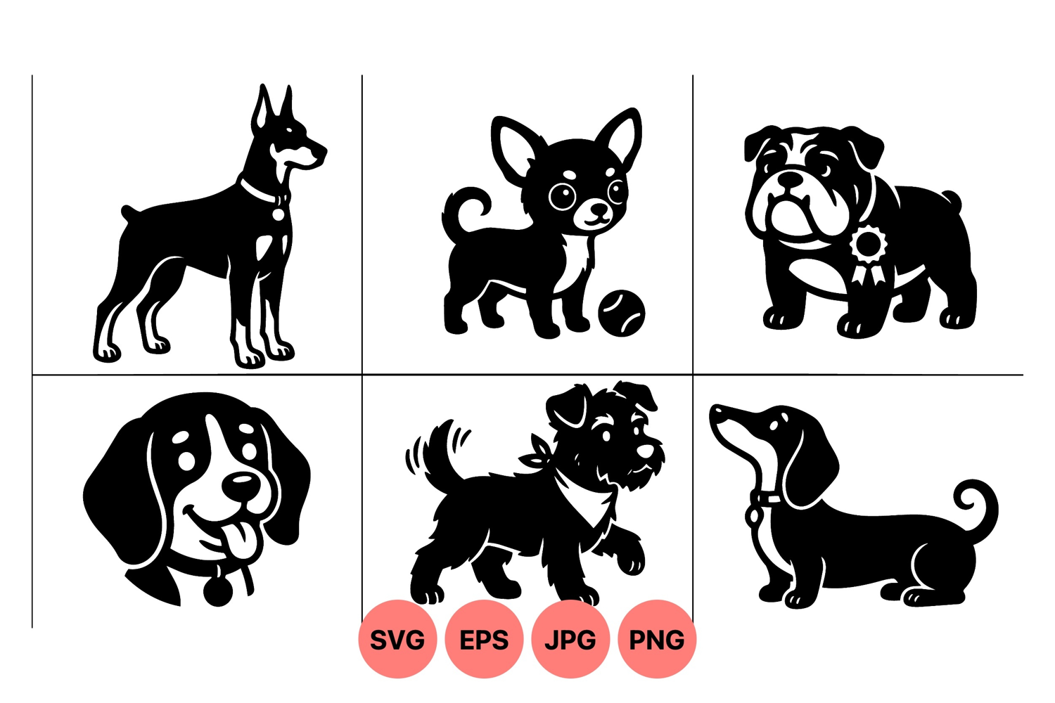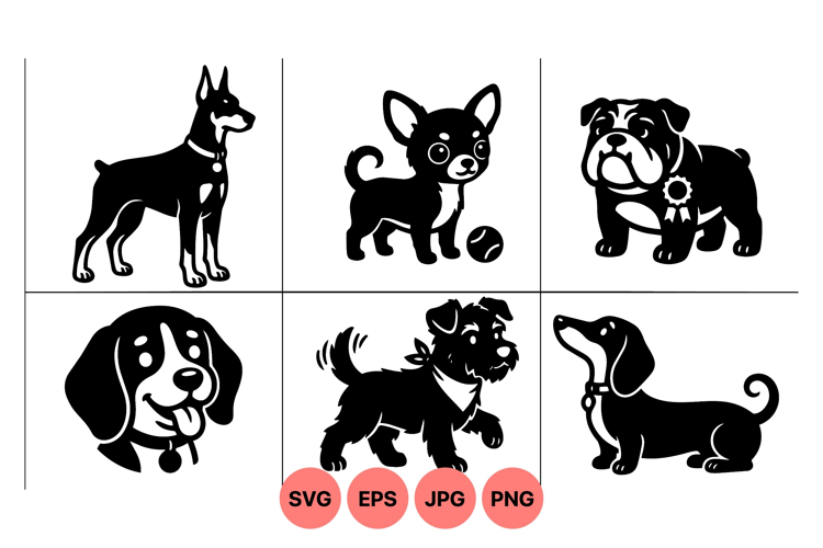 A of six black and white dog breed silhouettes including doberman chihuahua bulldog beagle terrier and dachshund shown in various poses with accessories in flat vector style peaceful