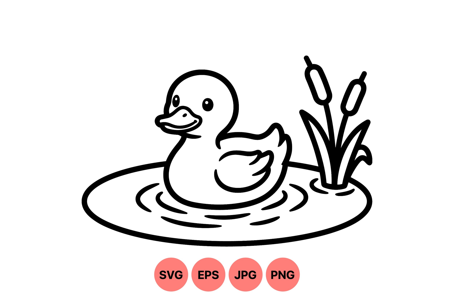 A minimalist line art style illustration of a duck swimming in a pond with cattail plants nearby shown in clear black outlines ideal for children coloring or educational materials lively and clean