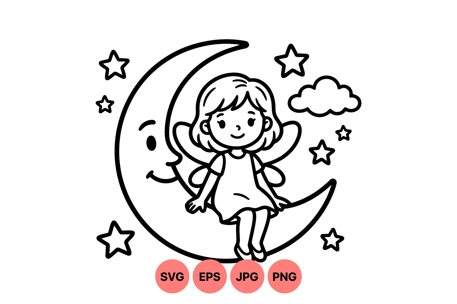 A charming fairy child with wings sits happily on a friendly crescent moon amid floating stars and a lone cloud in playful black and white line art style for children themed design.