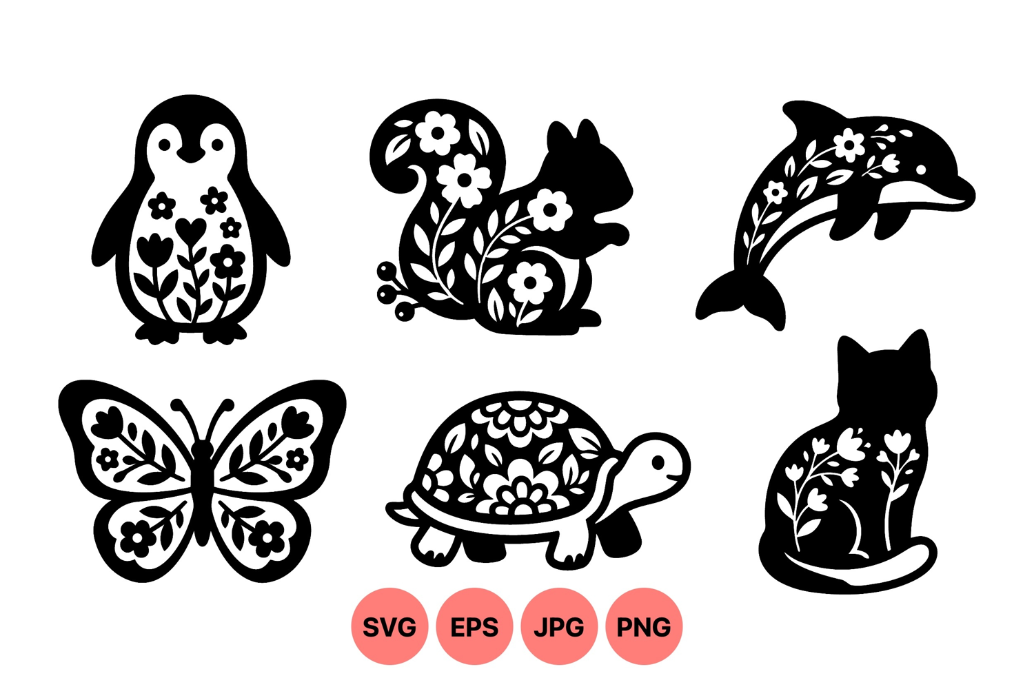 A of black silhouette animal vectors featuring a floral decoration style with penguin squirrel dolphin butterfly turtle and cat showcasing nature inspired design and elegance