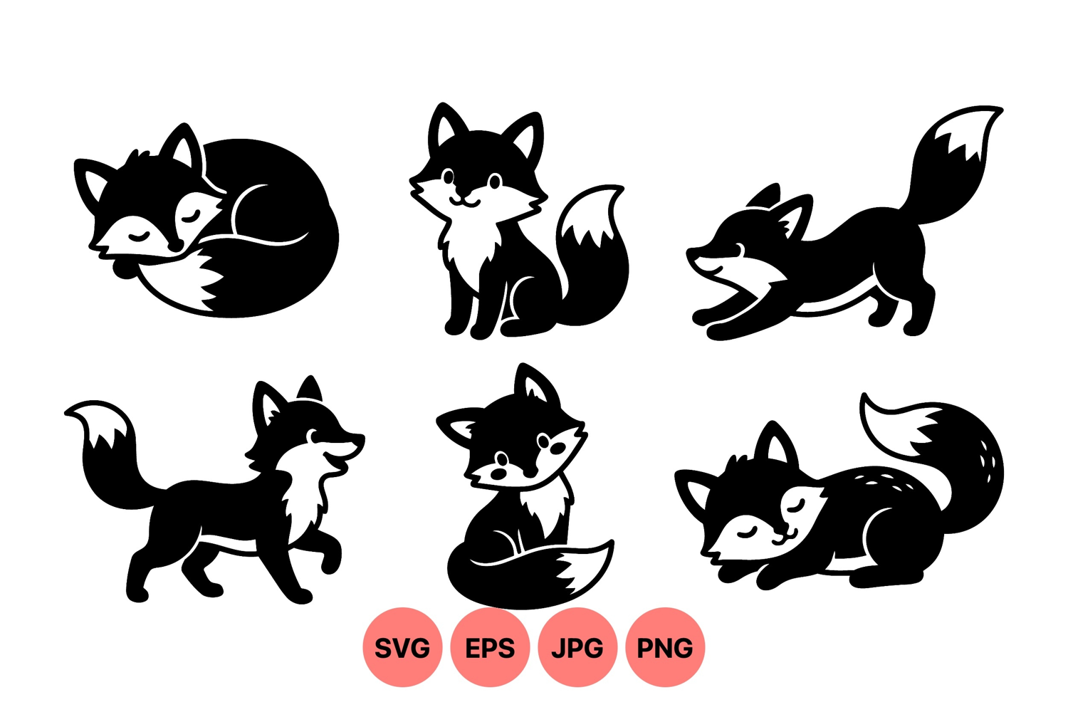 A of six black and white cartoon foxes showing playful, sitting, sleeping, and walking poses in a clean vector style perfect for children projects and branding with a friendly vibe