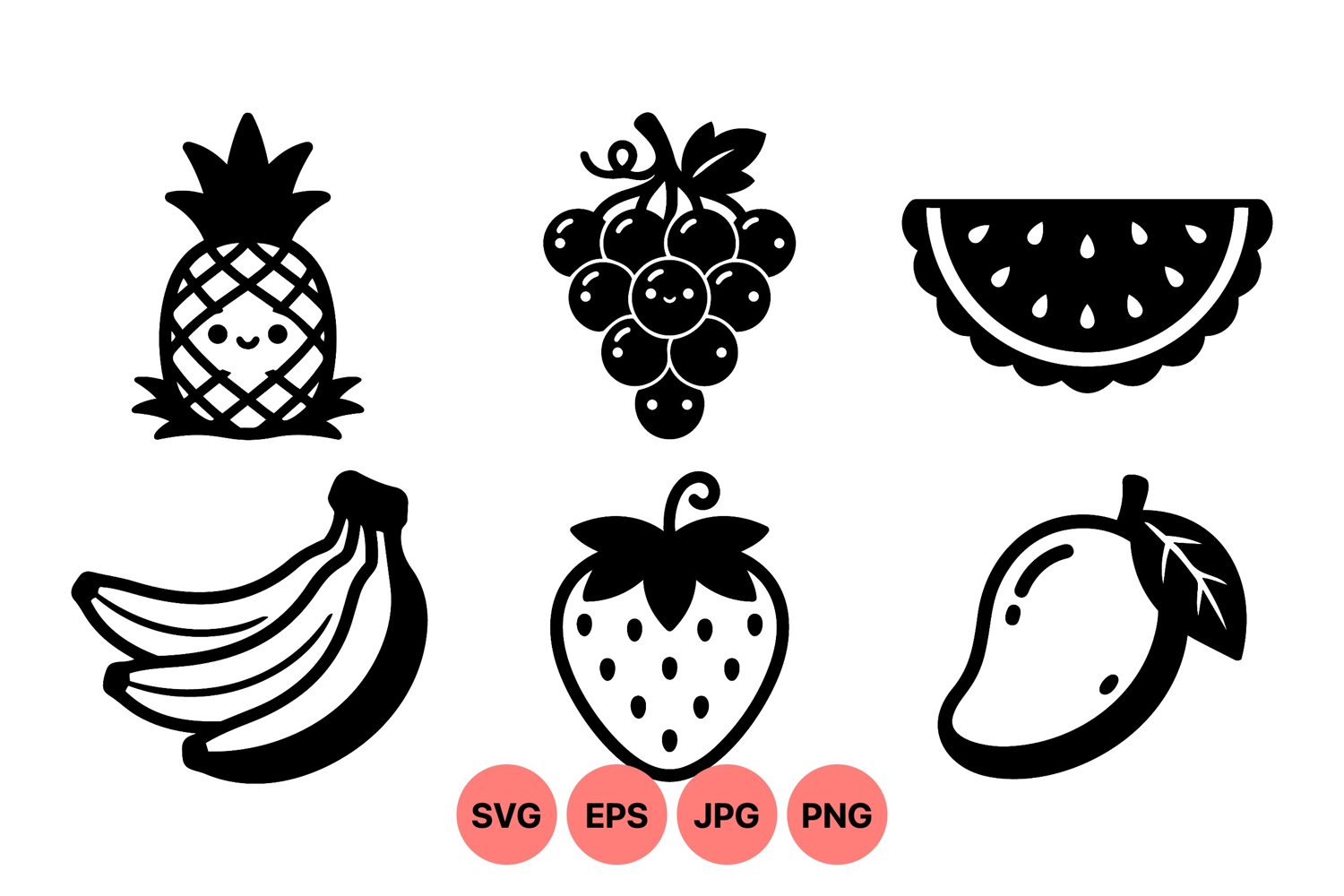 A of kawaii style black silhouette fruit icons including pineapple with face grapes banana strawberry mango and watermelon slice with playful expression design vibrant and charming
