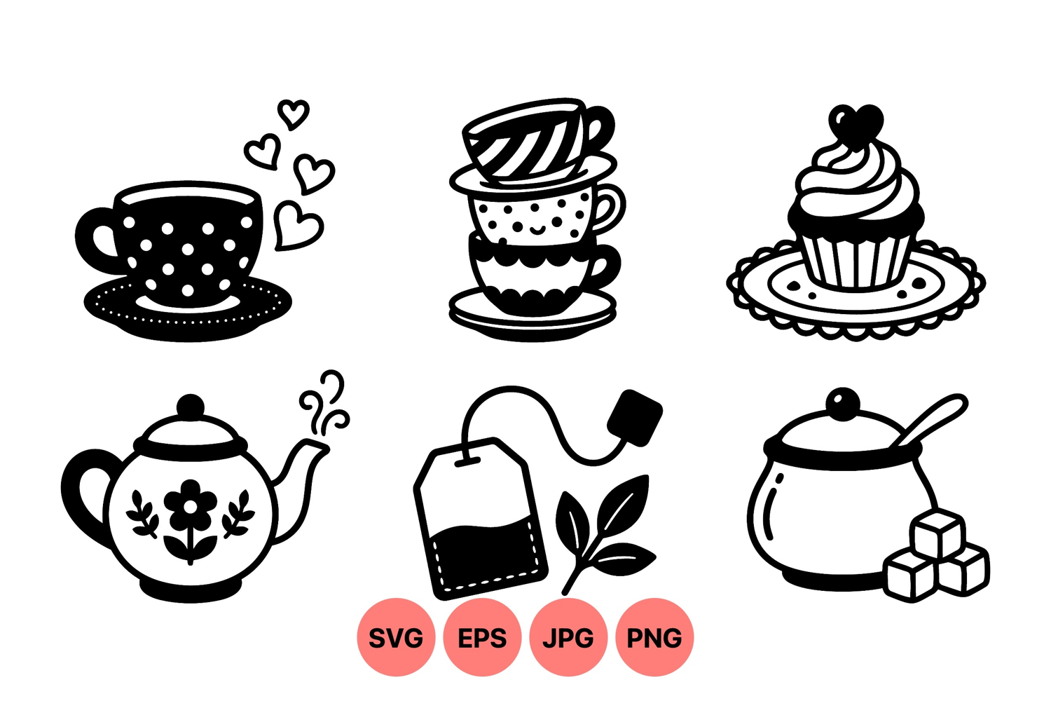 Tea Party Design Cute Cupcake Clipart Tea Cup Illustration Kitchen Decor Graphic Hand Drawn Tea Black White Tea Hot Beverage Drawing Tea Bag Artwork Dessert Plate Graphic Sugar Pot Illustration