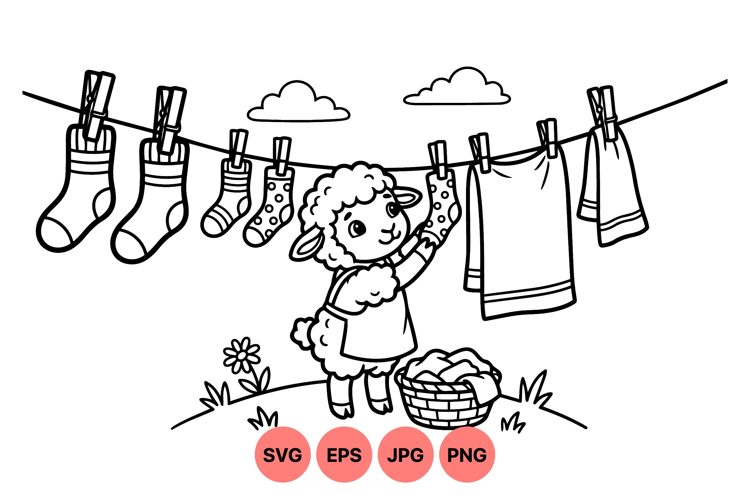 A charming lamb hangs patterned socks and towels on a clothesline outdoors with a basket of laundry nearby in a minimalist black line art style peaceful rural scene