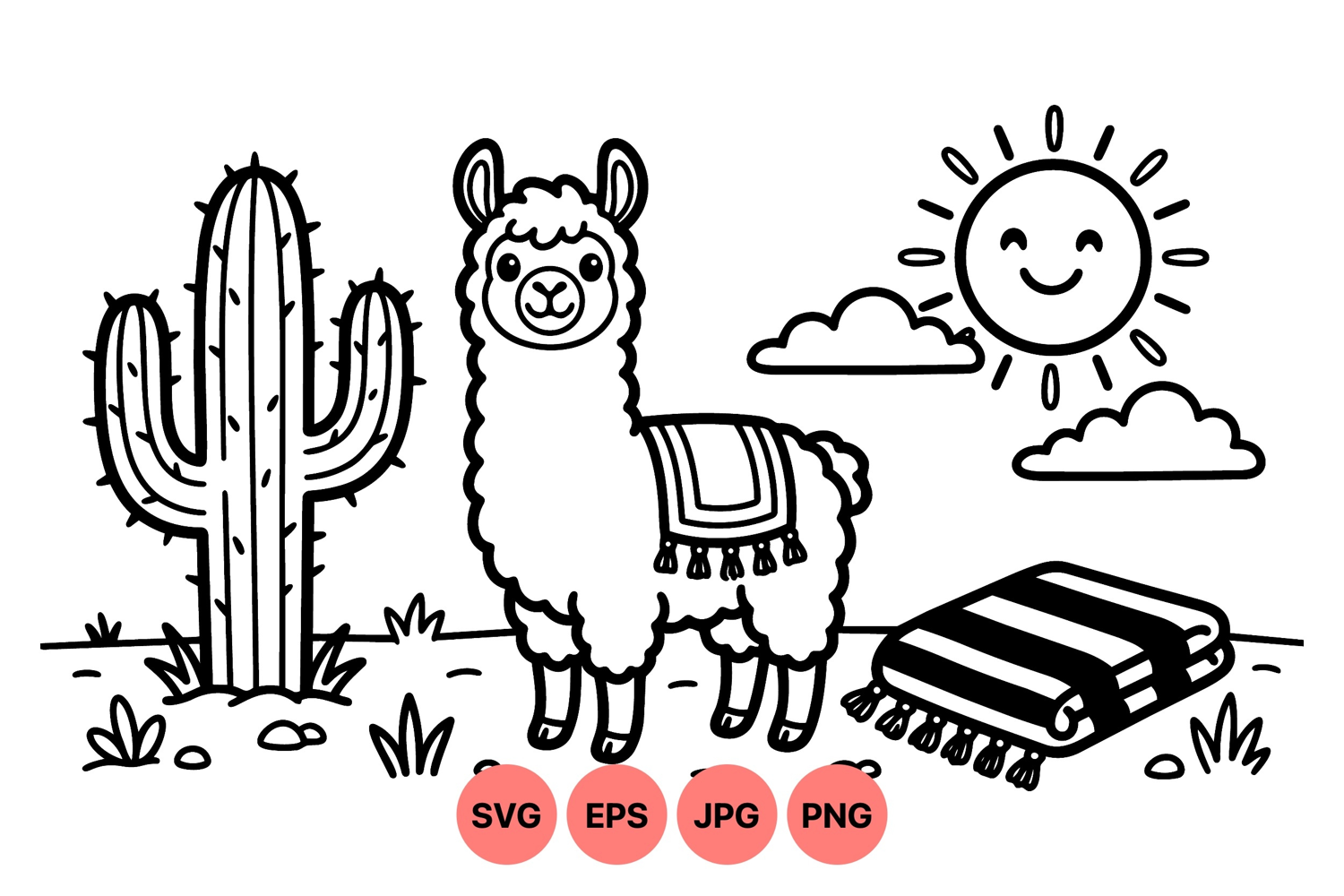 Llama Clipart Design Cute Cactus Drawing Digital Svg Art Black Line Vector Summer Wildlife Image Kids Coloring Illustration Playful Animal Graphic Desert Animal Artwork Sun And Clouds Art Friendly Cartoon Vector