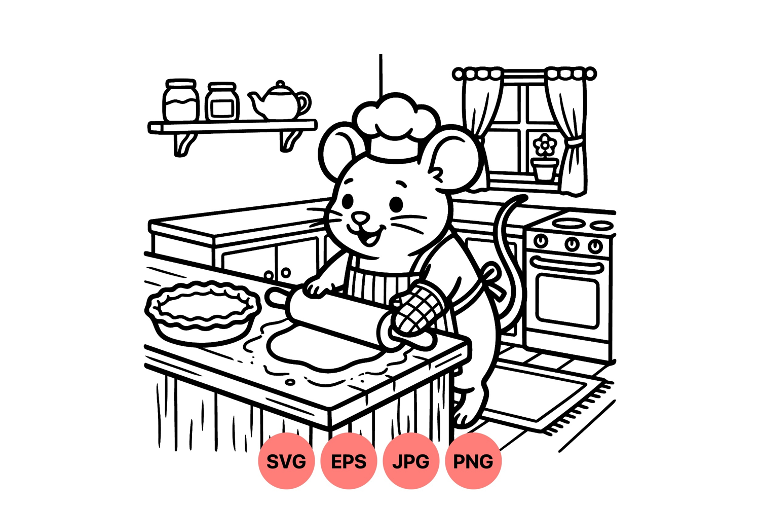 Black White Kitchen Cute Animal Cooking Kitchen Baking Illustration Chef Mouse Cartoon Baking Pie Clipart Rolling Pin Drawing Cooking Cartoon Art Children Kitchen Scene Home Baking Graphic Animal Chef Vector