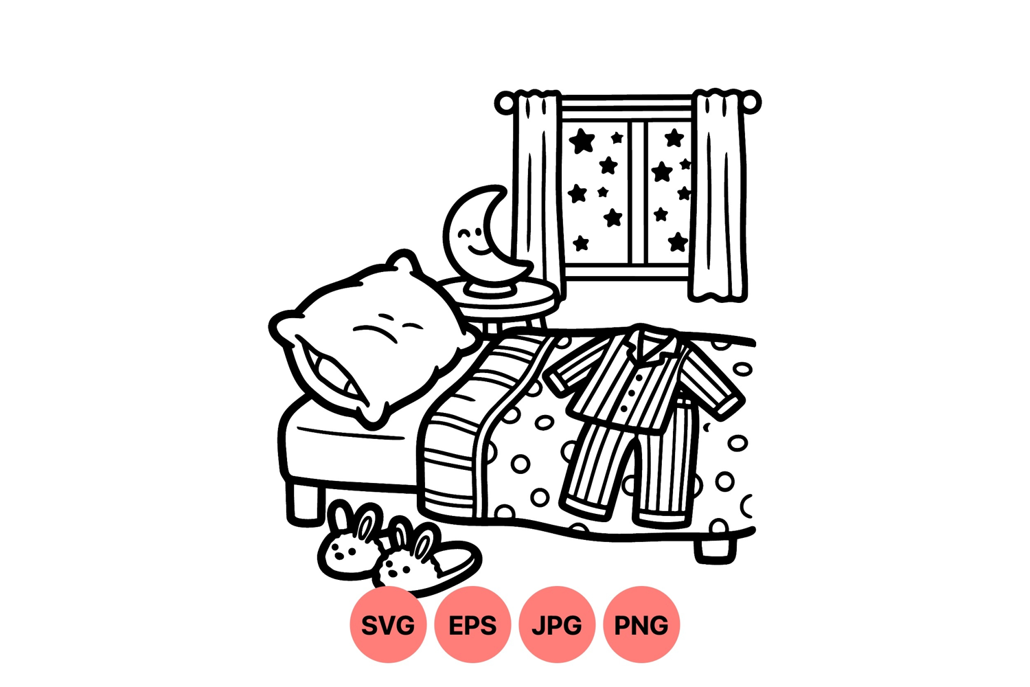Simple black and white line art showing a cozy childs bedroom scene with striped pajamas, a sleeping pillow, a crescent moon lamp, starry night window and bunny slippers creating a peaceful mood.