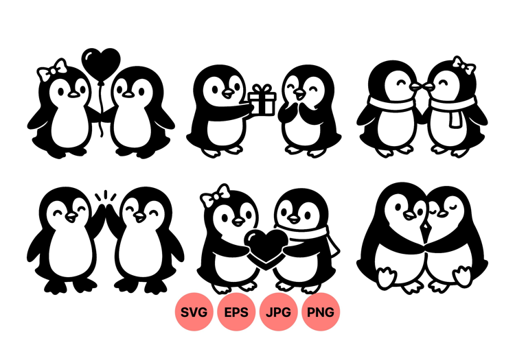 Playful black and white cartoon penguin couple illustrations showing romantic gestures like holding balloon gift heart and kissing conveying love and friendship mood
