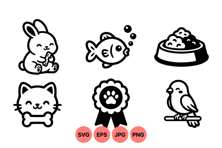of simple black and white vector pet icons including a happy rabbit eating a carrot, a goldfish blowing bubbles, smiling cat holding a bone, pet food bowl, bird perched on a branch, and a paw print award ribbon in minimalist style