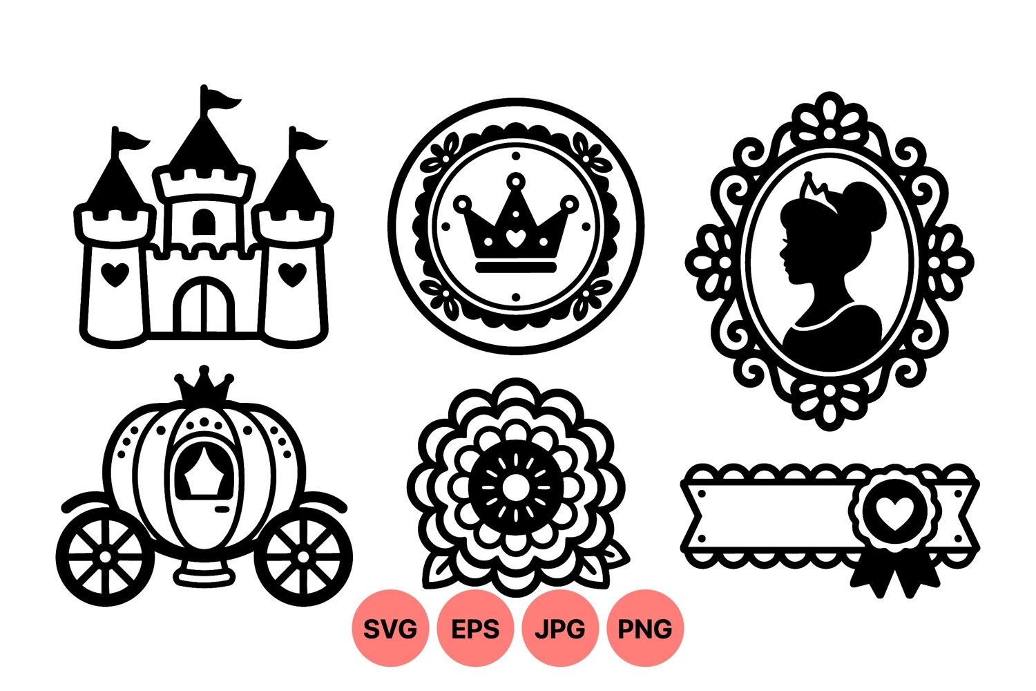 Black Outline Icons Decorative Frame Art Royal Crown Illustration Storybook Castle Design Princess Silhouette Clipart Fairytale Carriage Graphic Storybook Flower Drawing Princess Party Graphics Storybook Silhouette Art Royal Badge Decoration