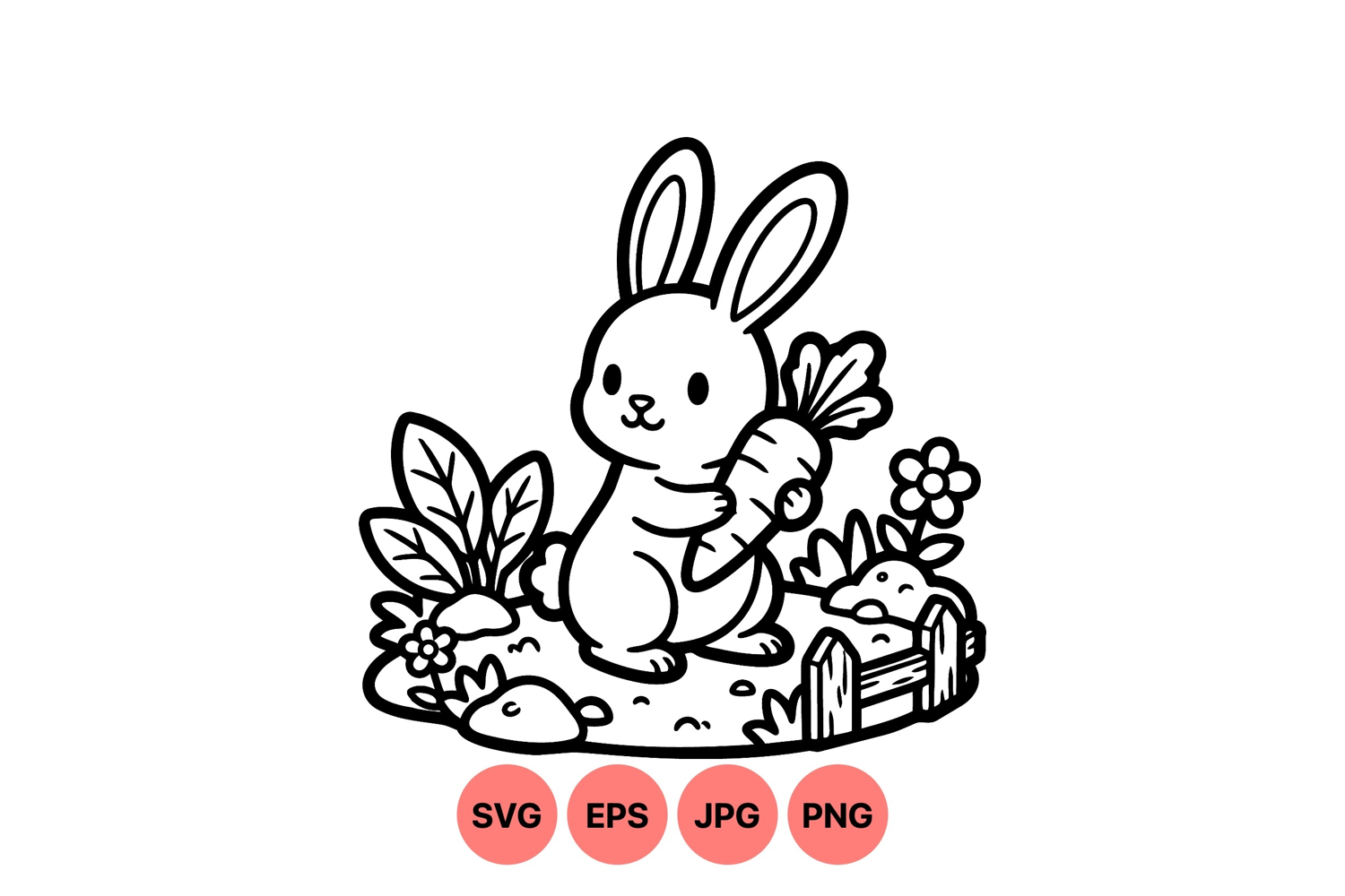 Adorable bunny clutching a carrot in a garden surrounded by plants flowers and a small wooden fence line art vector style perfect for kids illustration and editorial designs playful