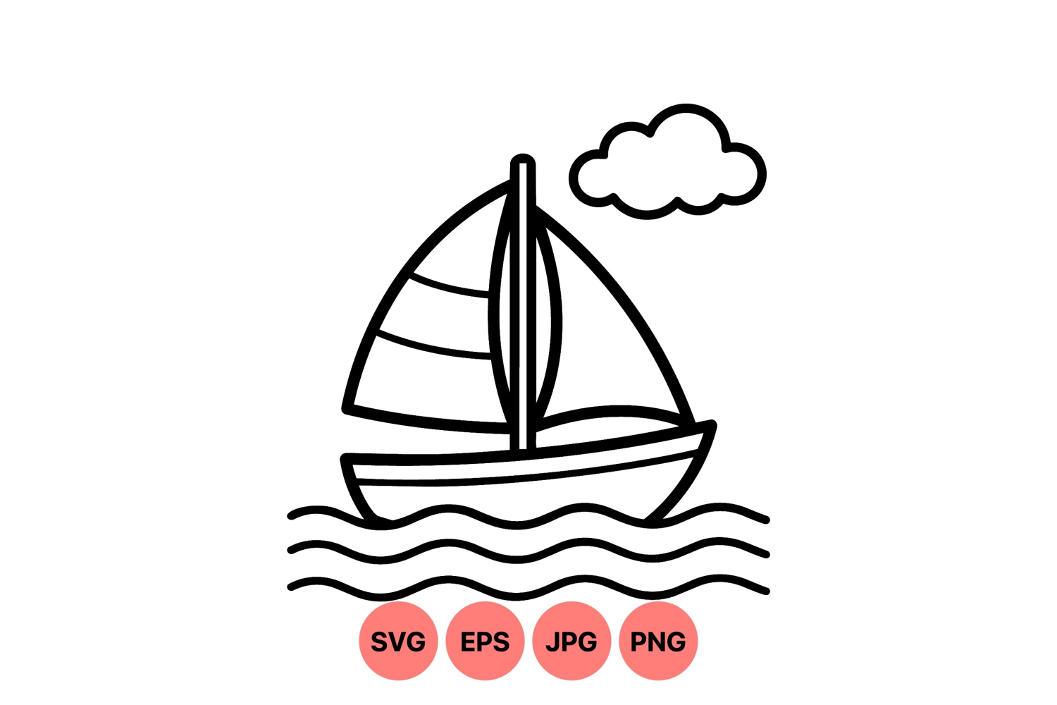 Minimal black line art depicts a sailboat sailing on gentle waves with a single cloud above calm water offering a clean and simple nautical theme vector illustration.