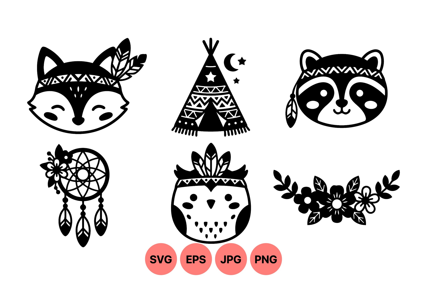 Forest Animal Graphics Boho Animal Clipart Kids Wall Decor Cute Owl Graphic Bohemian Feather Design Woodland Creature Design Tribal Fox Illustration Raccoon Face Drawing Native Teepee Image Dreamcatcher Vector Art