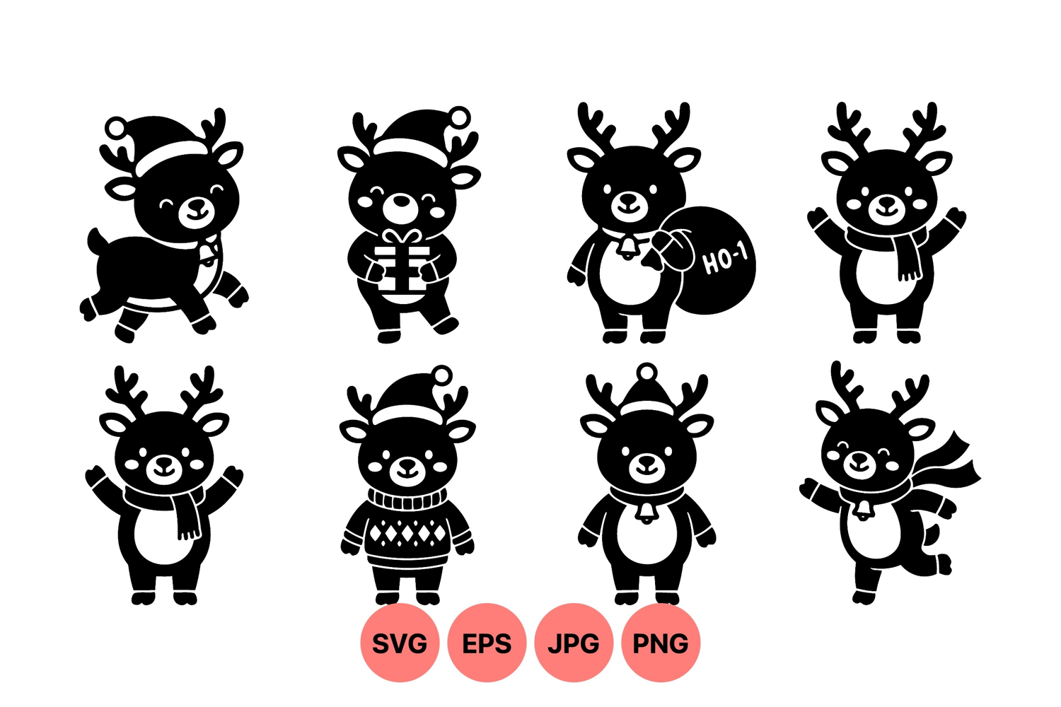 Black silhouette reindeer icons show festive poses with santa hats scarves gifts and bells in a simple playful style for seasonal design and holiday decoration purposes.