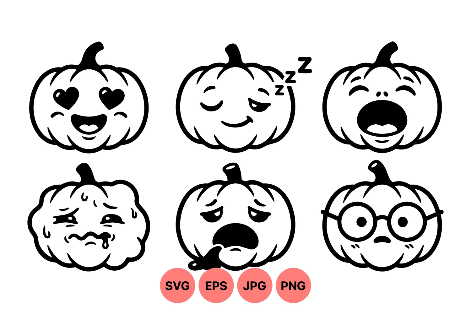 A black and white vector design showcasing six pumpkin faces with varied emotional expressions including love sleep yawning sweating drooling and nerdy glasses styles perfect for halloween themed projects and festive decorations in a playful mood