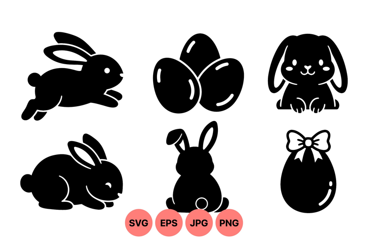 A of charming black silhouette rabbits in various playful poses alongside decorated eggs including one with bow in a simple vector art style suitable for seasonal designs and crafts.