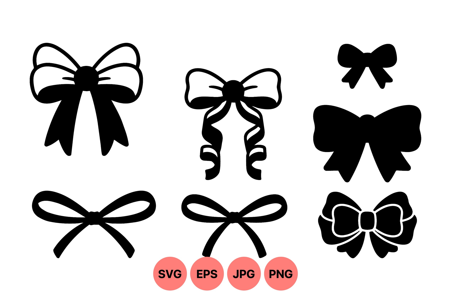 A of black bow silhouettes featuring various ribbon shapes and styles, from simple loops to decorative curls, designed for versatile graphic use and project decoration.