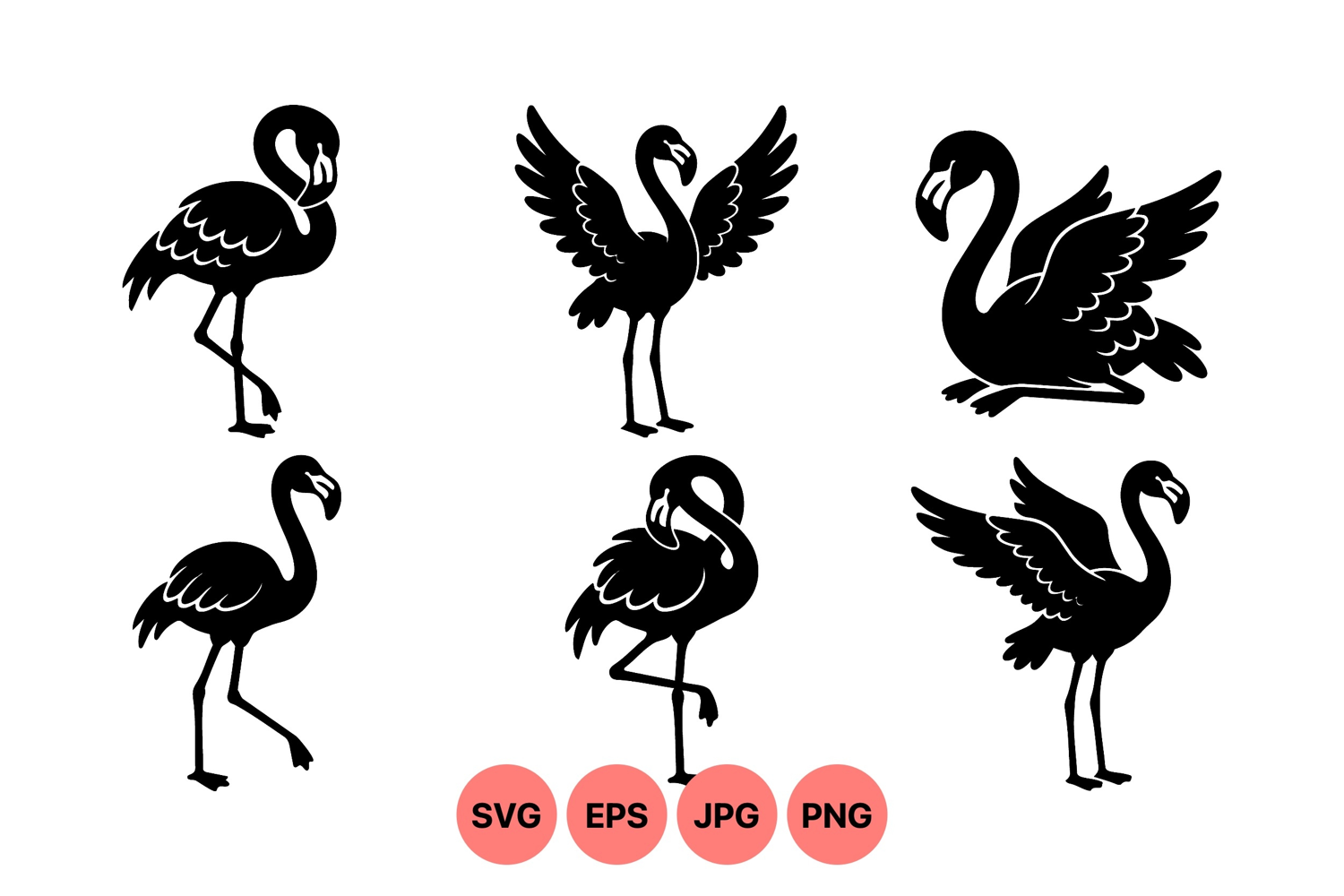 Black flamingo silhouettes showcase different positions including standing walking flying and sitting with wings spread in minimalist vector style suitable for decorative or educational purposes