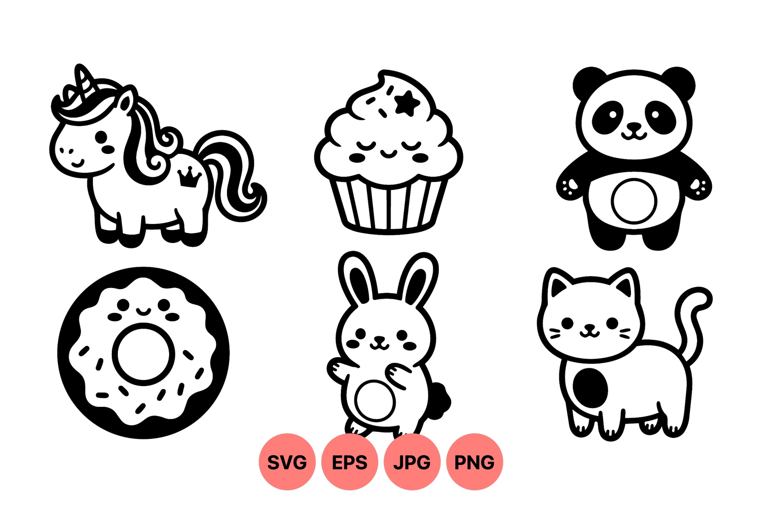 Playful cartoon style black and white icons of a unicorn with crown cupcake with star panda bear donut with sprinkles bunny and smiling cat in vector design for children