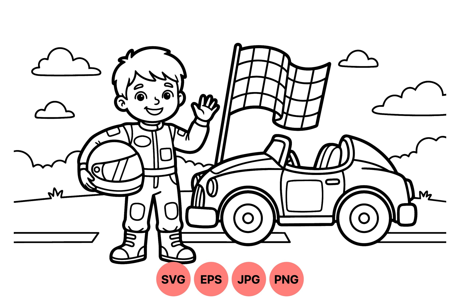 A joyful boy in racing suit waves and holds helmet beside a classic race car and a checkered flag on a racetrack under a clouded sky line art vector suitable for kids coloring books cheerful mood