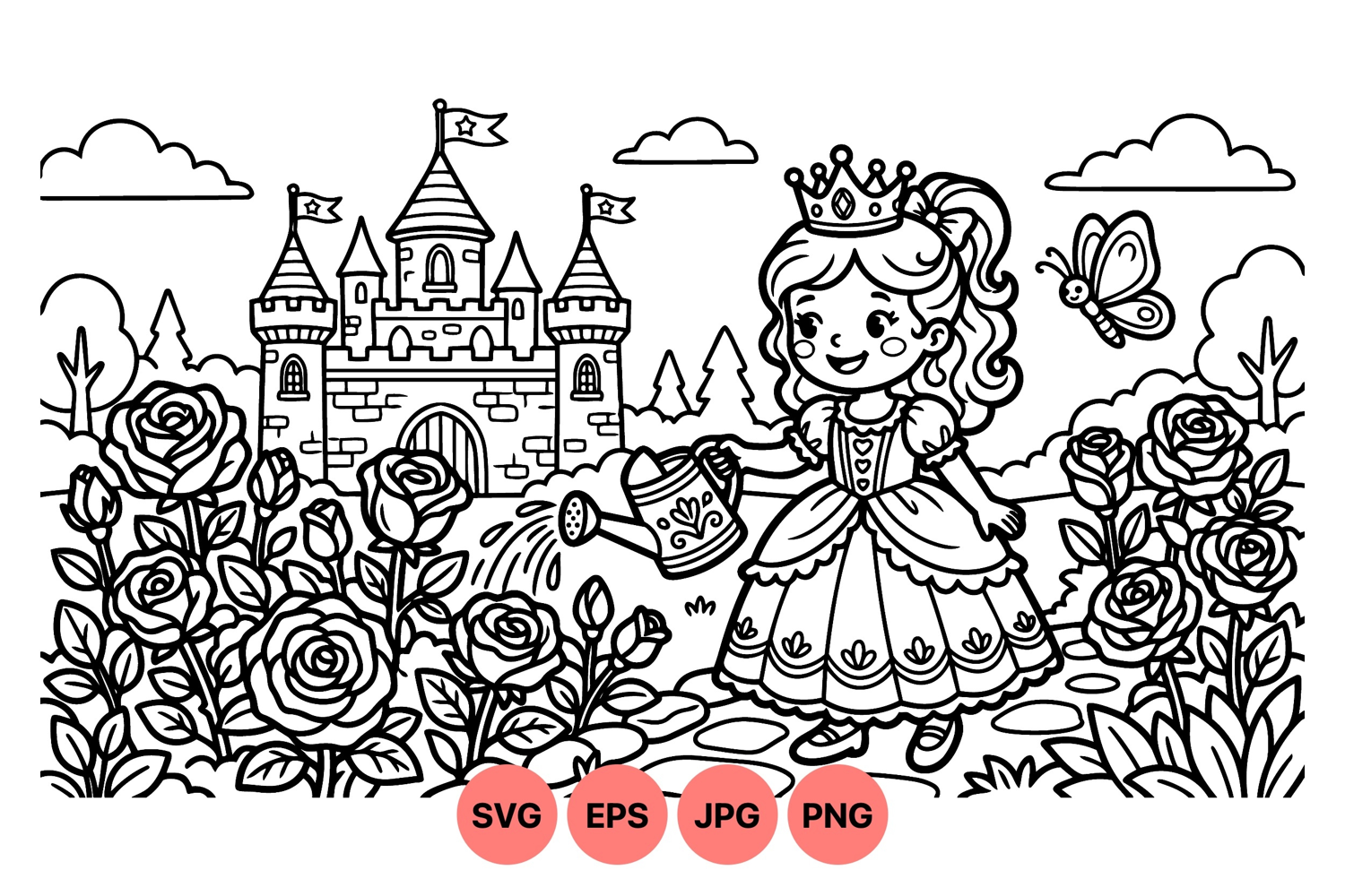A whimsical princess waters blooming roses in a garden with a castle and butterfly nearby in a charming fairy tale style black and white line art vector illustration.