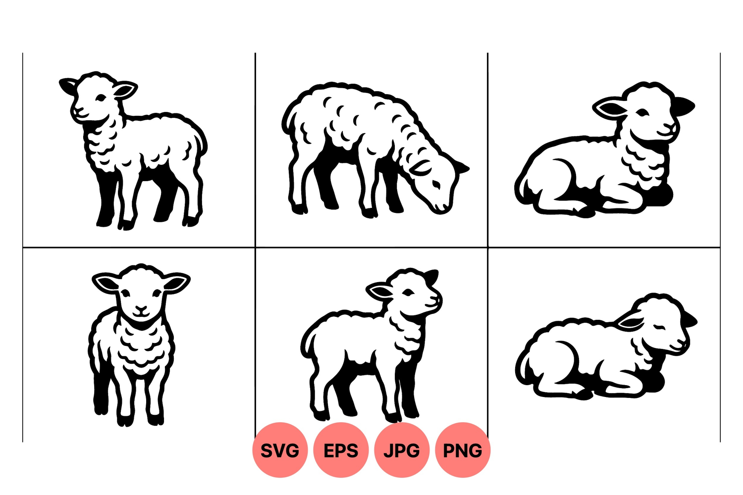 A of six black and white lambs shown in different poses including standing grazing and resting rendered in vector style with clean lines and simple details