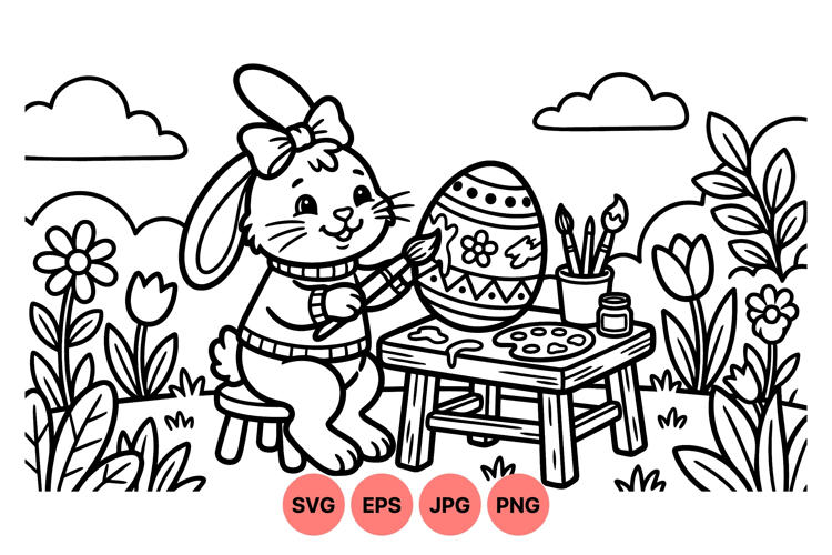 A cheerful bunny with a bow paints a decorated easter egg using brushes and paint pots outdoors among flowers and clouds in a playful spring garden scene