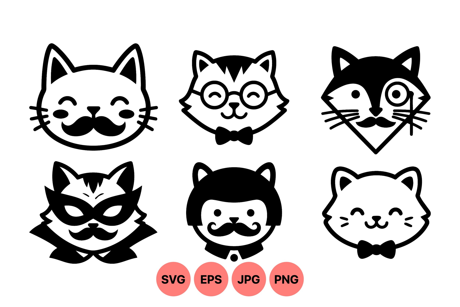 Six black and white minimalist cat face icons feature mustaches glasses and bow ties in diverse charming expressions suitable for digital projects print designs and branding.