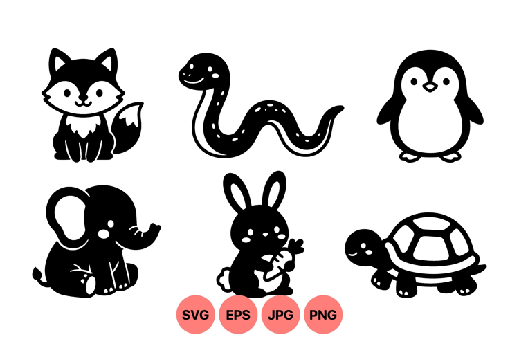 Black and white flat vector showcases adorable baby animals with smiling faces including fox snake penguin elephant bunny and turtle in minimalist cartoon style suitable for kids designs friendly and charming