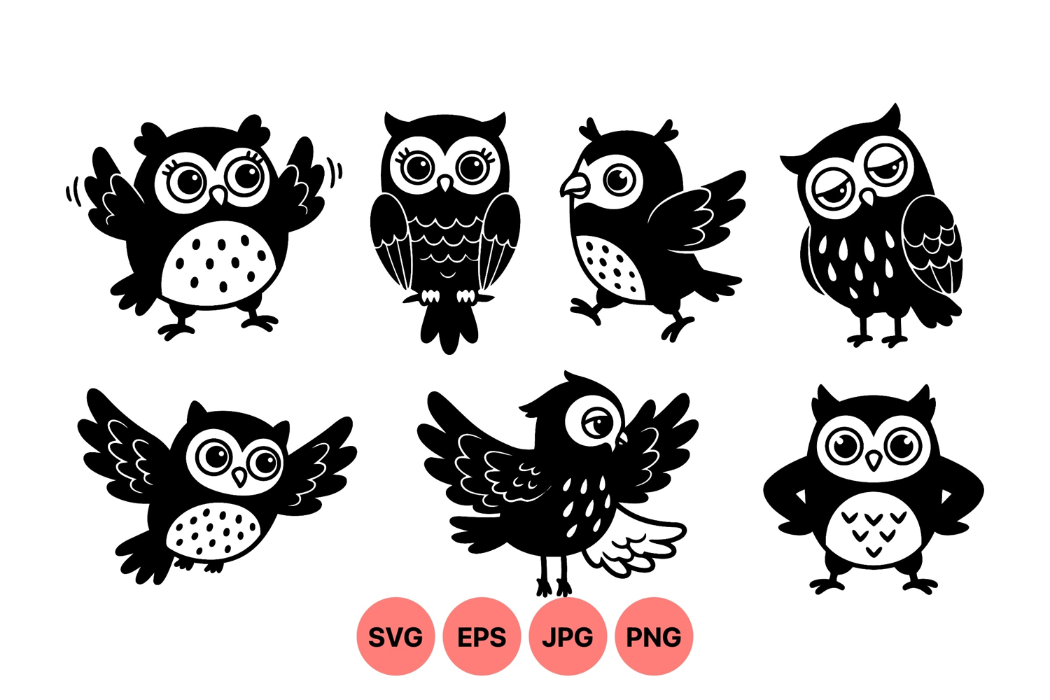 A of black and white cartoon owl illustrations showing playful, flying, standing, and relaxed poses in a simple flat vector style for versatile design projects with a whimsical mood.