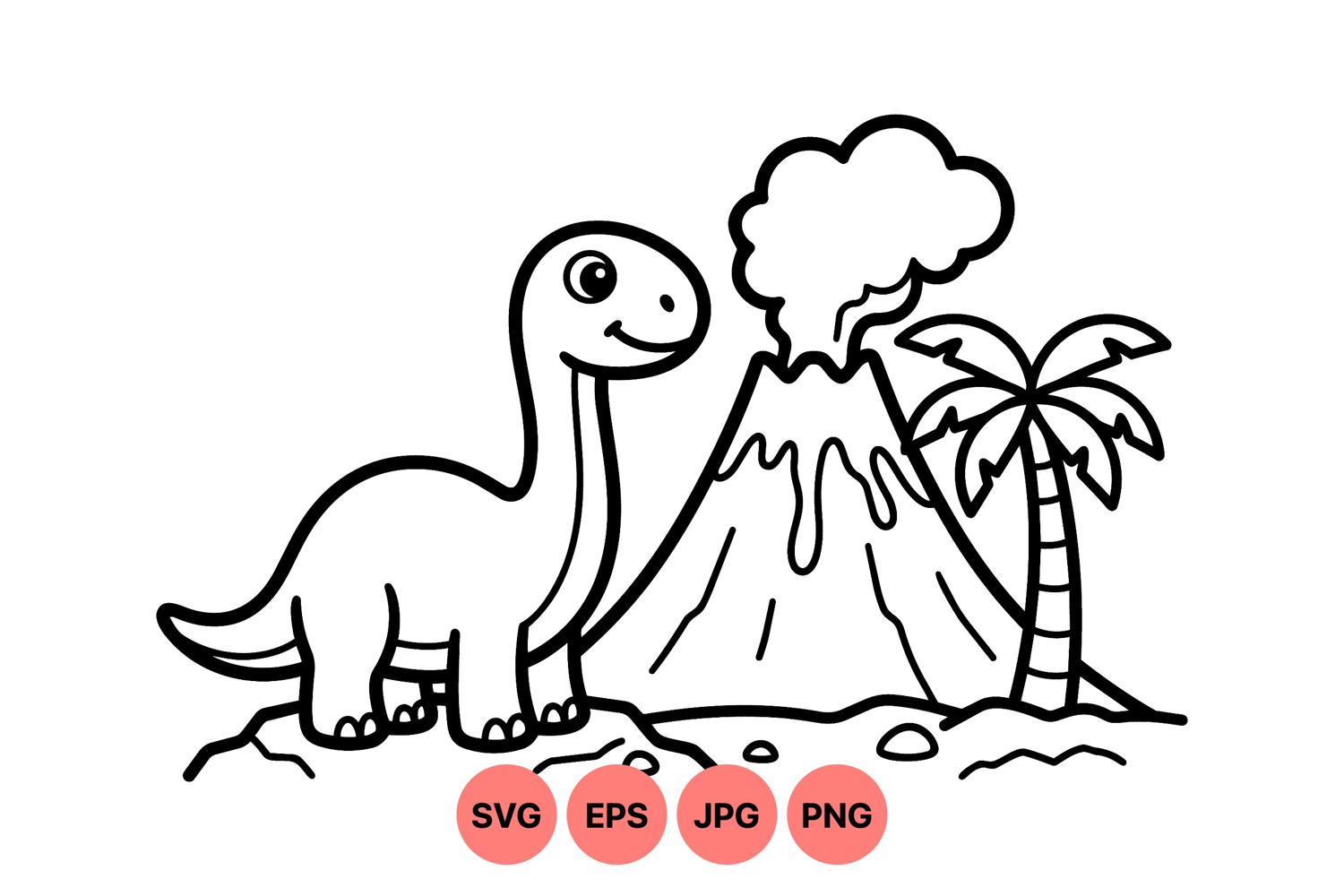 A charming black and white line art vector shows a friendly dinosaur next to an erupting volcano producing smoke with a palm tree nearby in a simple cartoon style cheerful mood