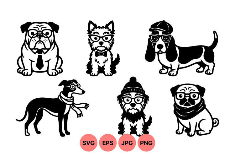 Vector illustration showing six different dog breeds wearing accessories like glasses tie hat and scarf in black and white style suitable for pet themed designs playful and charming