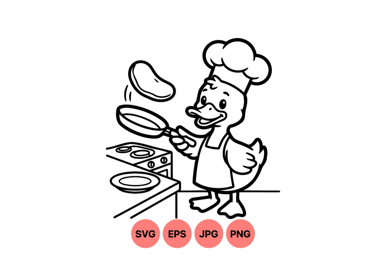 A cheerful duck character in a chef hat flips a pancake with a frying pan next to a stove and plate shown in clean black line art style perfect for coloring or children illustration.