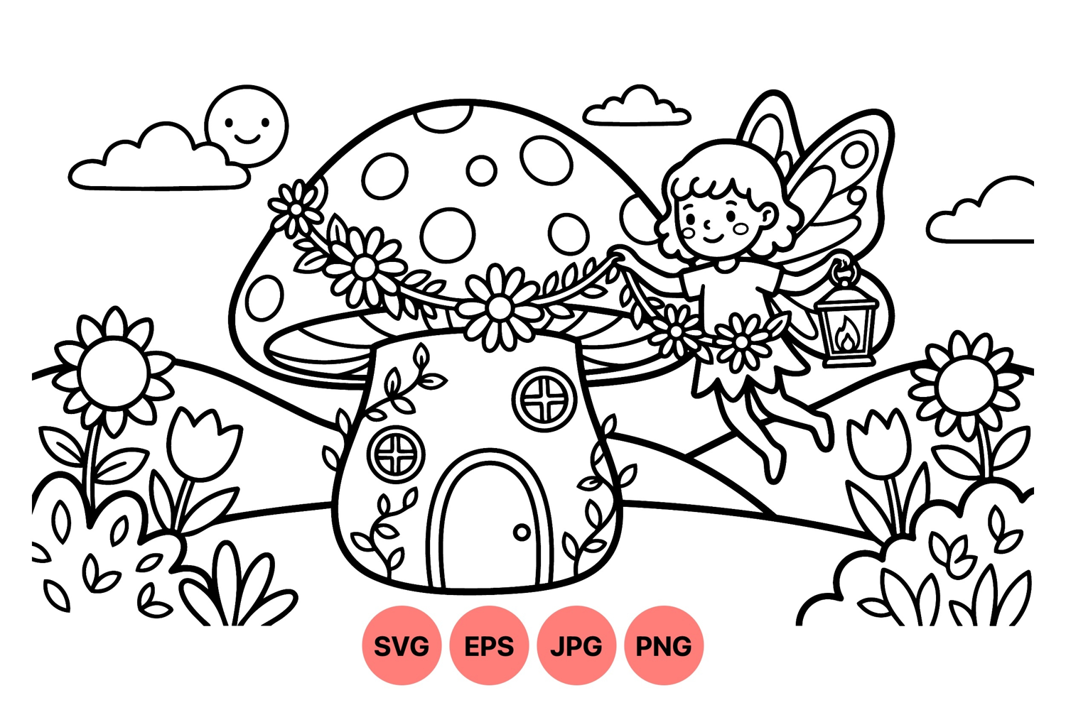 A whimsical line art scene shows a fairy holding a lantern and flower garland flying beside a mushroom shaped house with windows and door surrounded by flowers and hills in daylight peaceful mood