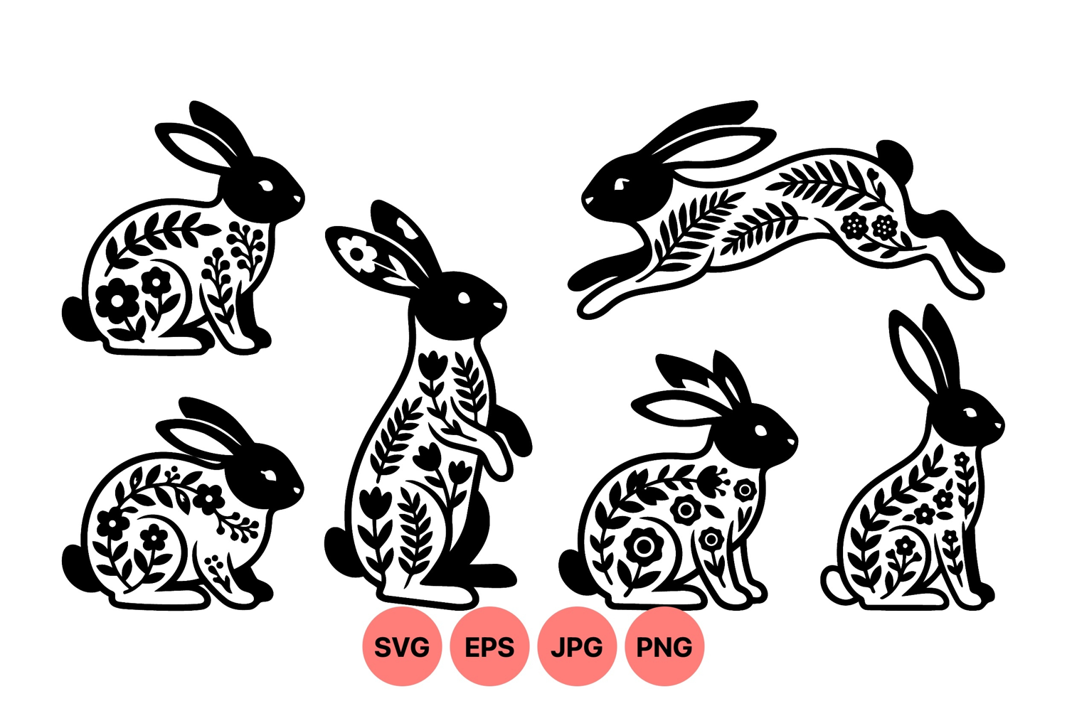 Stylized black and white rabbit silhouettes decorated with intricate floral and leafy patterns in various sitting and jumping poses designed as vector art for decoration and design projects.