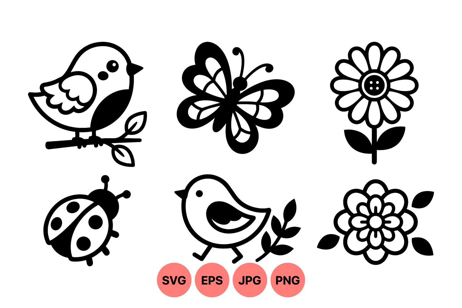 A flat design presenting black and white icons featuring birds perched and walking butterfly ladybug and two floral flower motifs ideal for nature projects minimal vibe