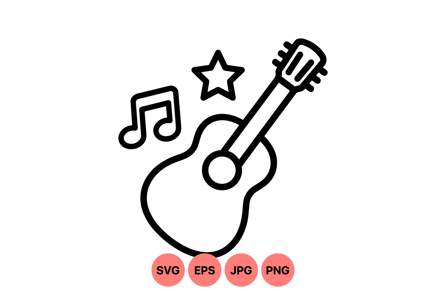 Clean black line art vector of a guitar accompanied by a music note and star icon representing music and entertainment in a minimalistic style