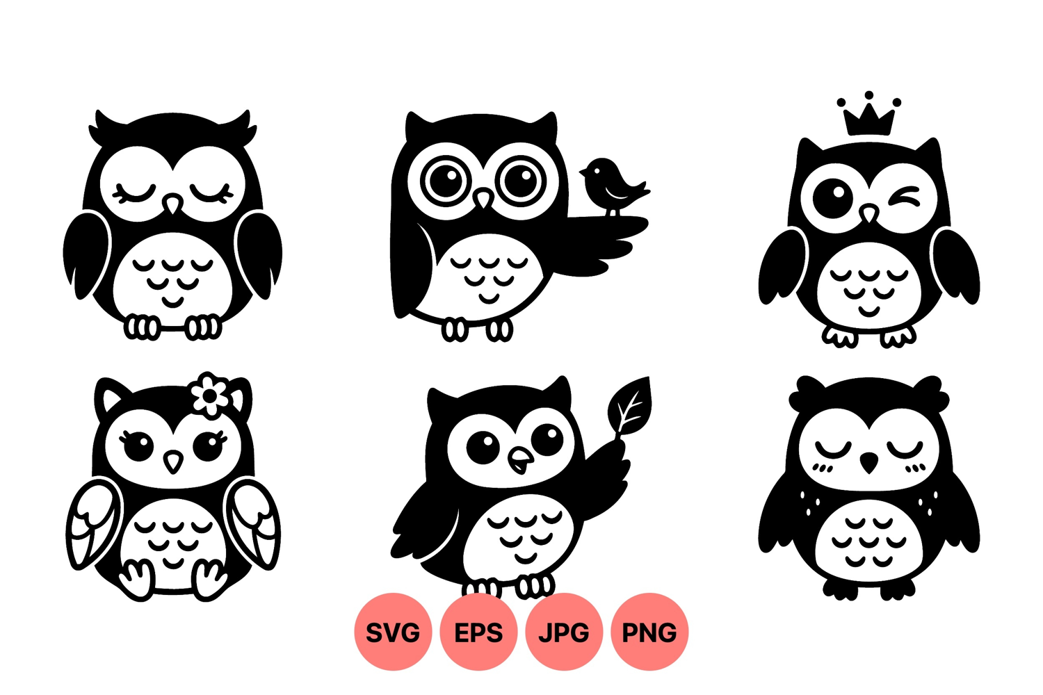 A of six cute owl silhouettes showing various expressions and poses including winking owl with crown flowered owl and leaf holding owl in flat graphic style playful mood
