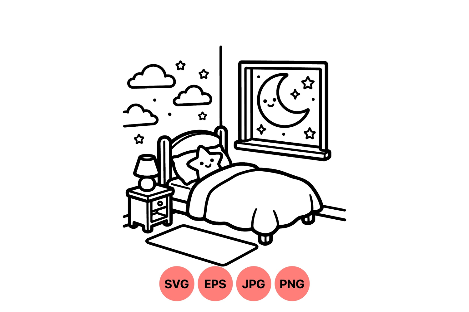 Line art bedroom illustration features a cozy bed with smiling star pillow beside a night window showing moon and stars with bedside lamp and simple rug peaceful mood