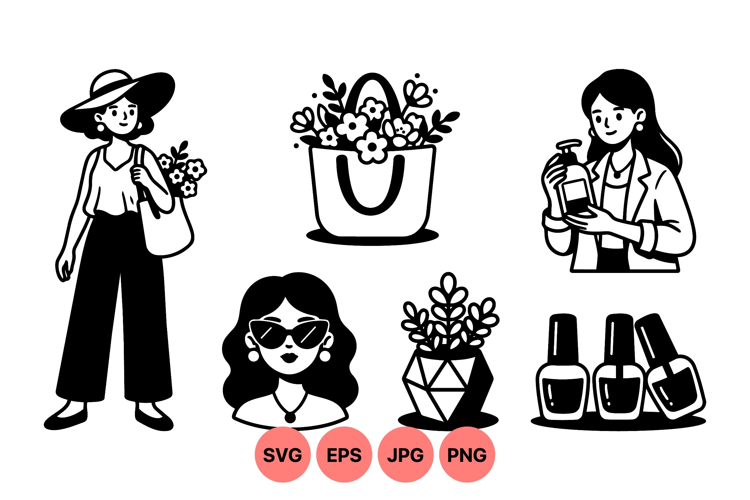 Monochrome vector composition includes a woman carrying flowers in a tote bag with hat, a stylish woman wearing sunglasses, a female examining a bottle, geometric plant pot, and nail polish bottles, casual minimalist design ideal for beauty and lifestyle themes, simple elegant mood