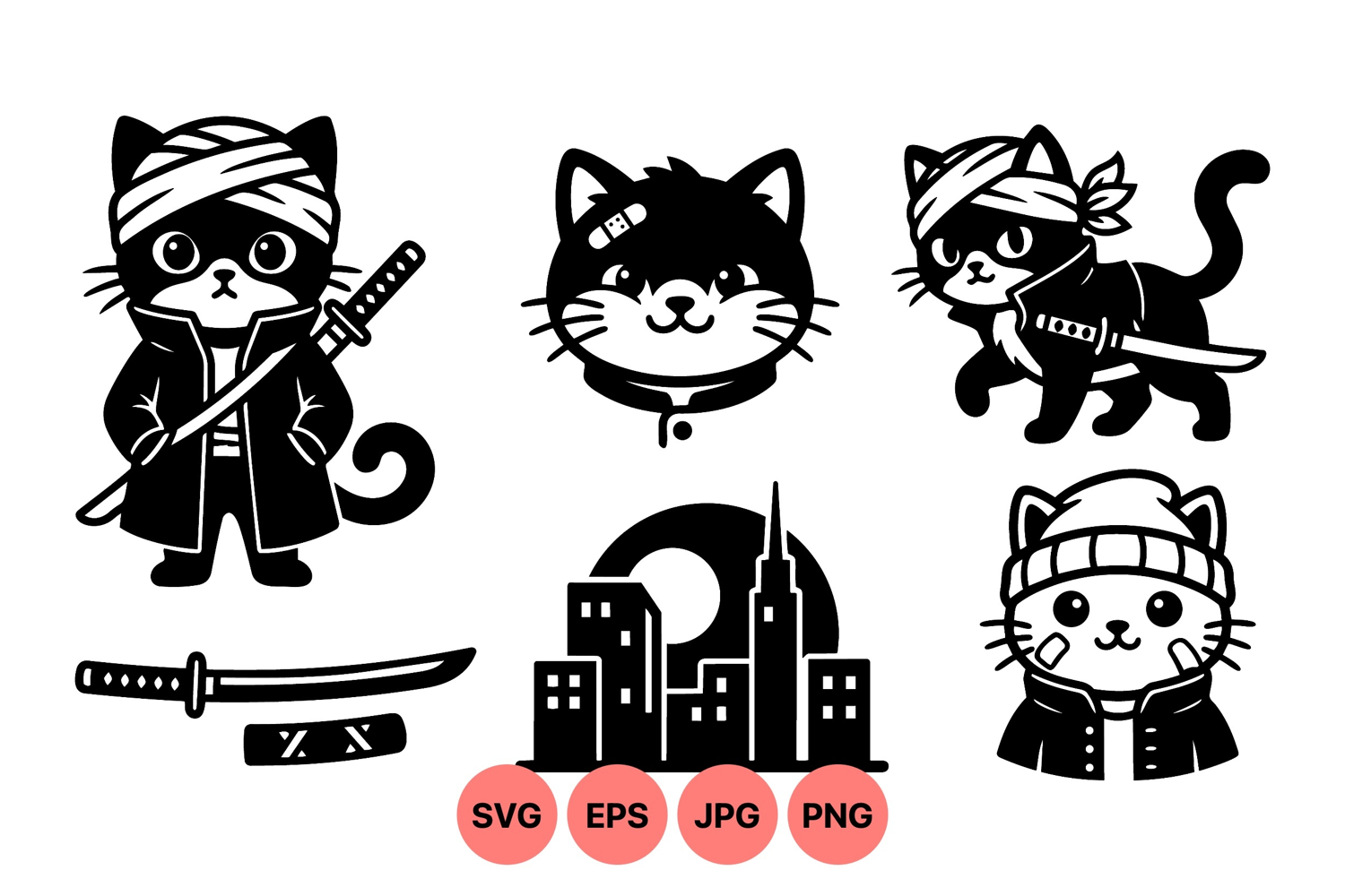 Vector art depicting ninja cats with swords in black and white silhouette style includes cat headshots and a night city skyline with a modern minimalist vibe