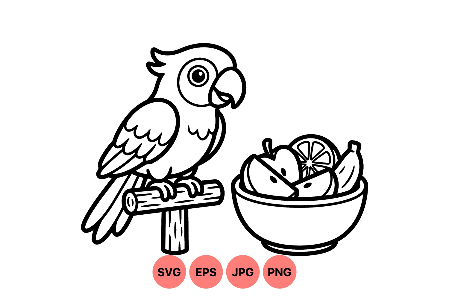 A black outlined vector showing a parrot on a wooden perch looking towards a bowl filled with sliced apples banana and orange segment in simple line art style