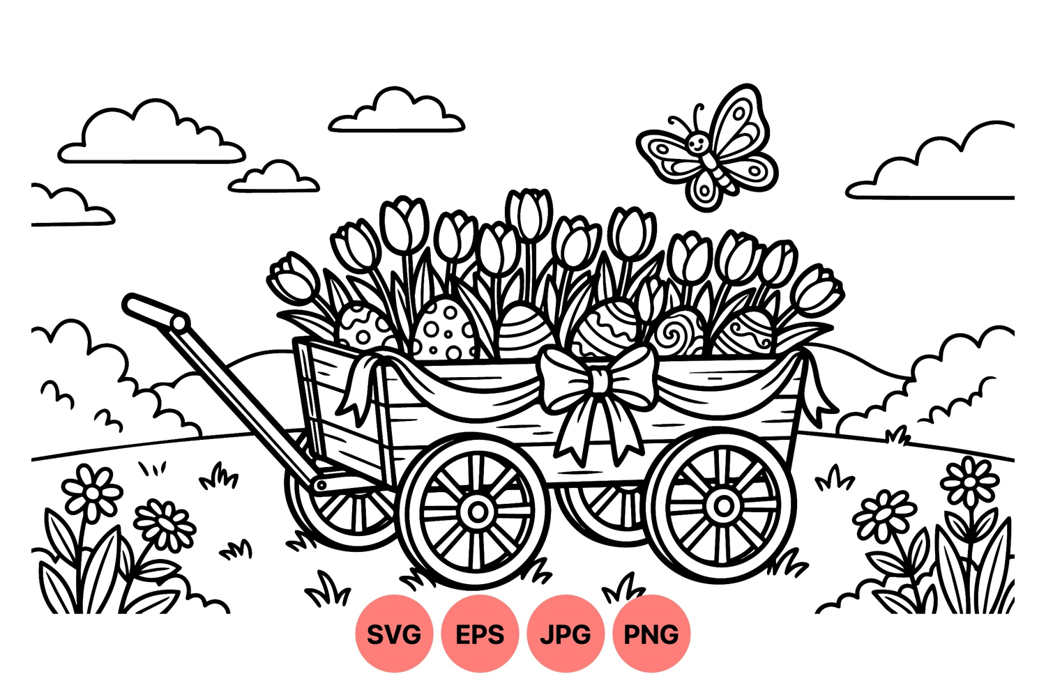 A detailed black and white line art shows a wooden wagon holding decorated easter eggs surrounded by tulip flowers, with a smiling butterfly flying above, in a peaceful outdoor landscape scene.