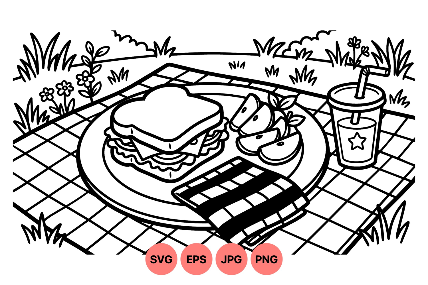 A black and white line art illustration shows a picnic setup with a sandwich apple slices napkin and juice cup on a checkered blanket surrounded by grass and flowers in a peaceful outdoor setting.