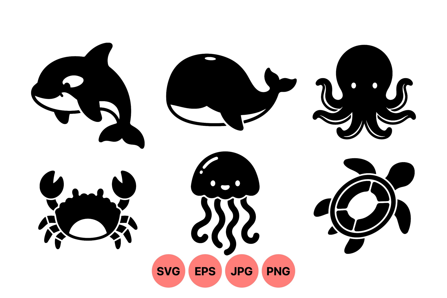 Black silhouette icons represent killer whale whale octopus crab jellyfish and sea turtle as marine animal symbols in a simple vector style design